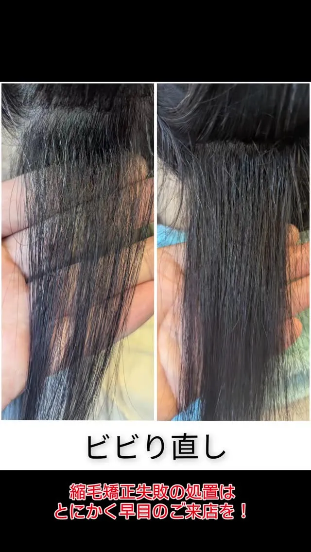 一方で、髪の内部まで深刻に損傷し、切れ毛や根折れが進行している場合は、修正が難しくなることがあります。特に、複数回の縮毛矯正やカラー、ブリーチなどを繰り返している髪は、リスクが高まります。