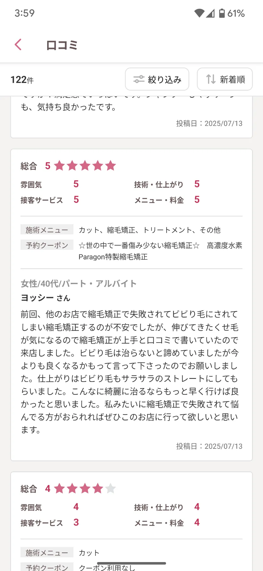 また、施術後のアフターケアやホームケアについても詳しく指導し、再発防止や長期的な美髪維持をサポート。「他店での縮毛矯正失敗をきっかけにパラゴンヘアーに相談し、安心して任せることができた」「施術中も仕上がり後も、納得のいく説明と対応があった」といった口コミも多数です。