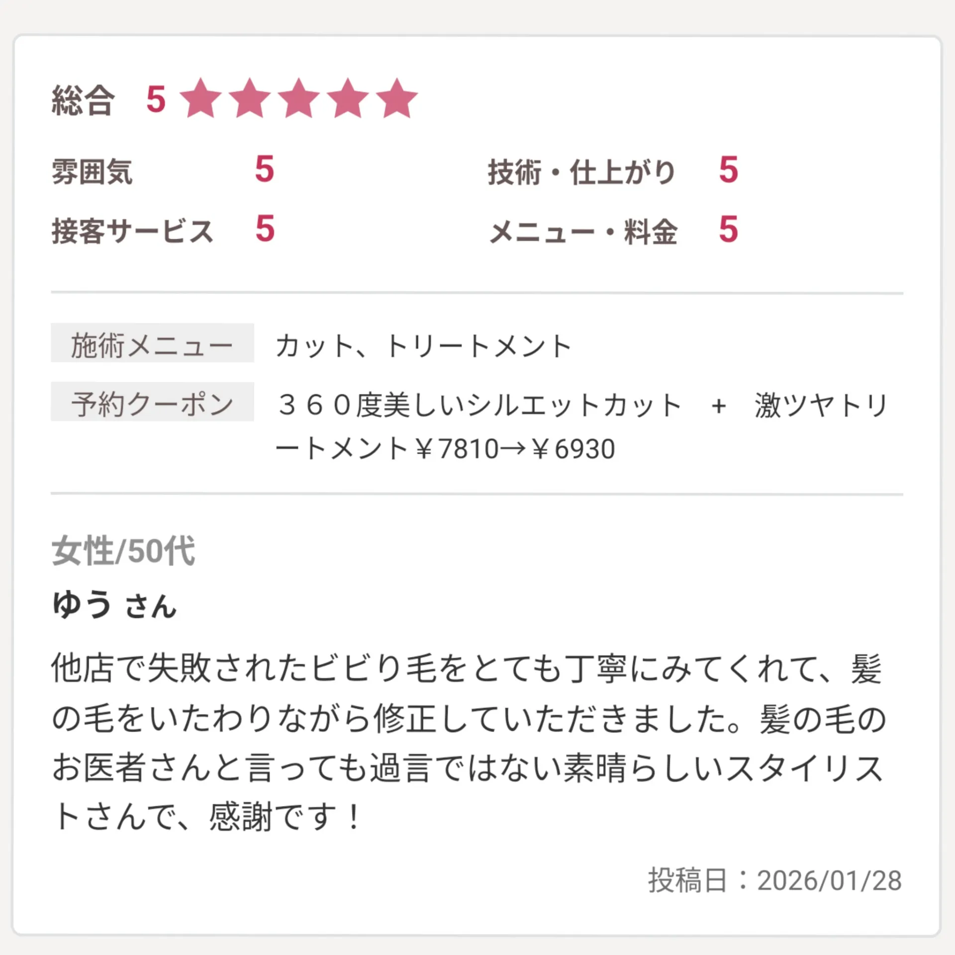 実際の口コミでは「仕上がりが自然で柔らかい」「ツヤが出て指通りが良くなった」「毎朝のスタイリングが楽になった」といった声が多く寄せられています。これらの評価は、サロンが一人ひとりの髪の状態や理想に合わせた施術を行っている証拠です。