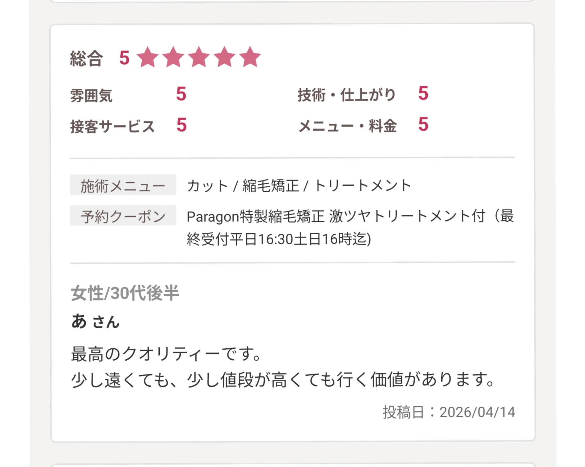 「他店で満足できなかった」「髪のダメージが心配」という方でも、実際にパラゴンヘアーで理想の美髪を手に入れた声が多数。口コミを参考にすることで、安心して施術を受けられるサロン選びが可能となります。